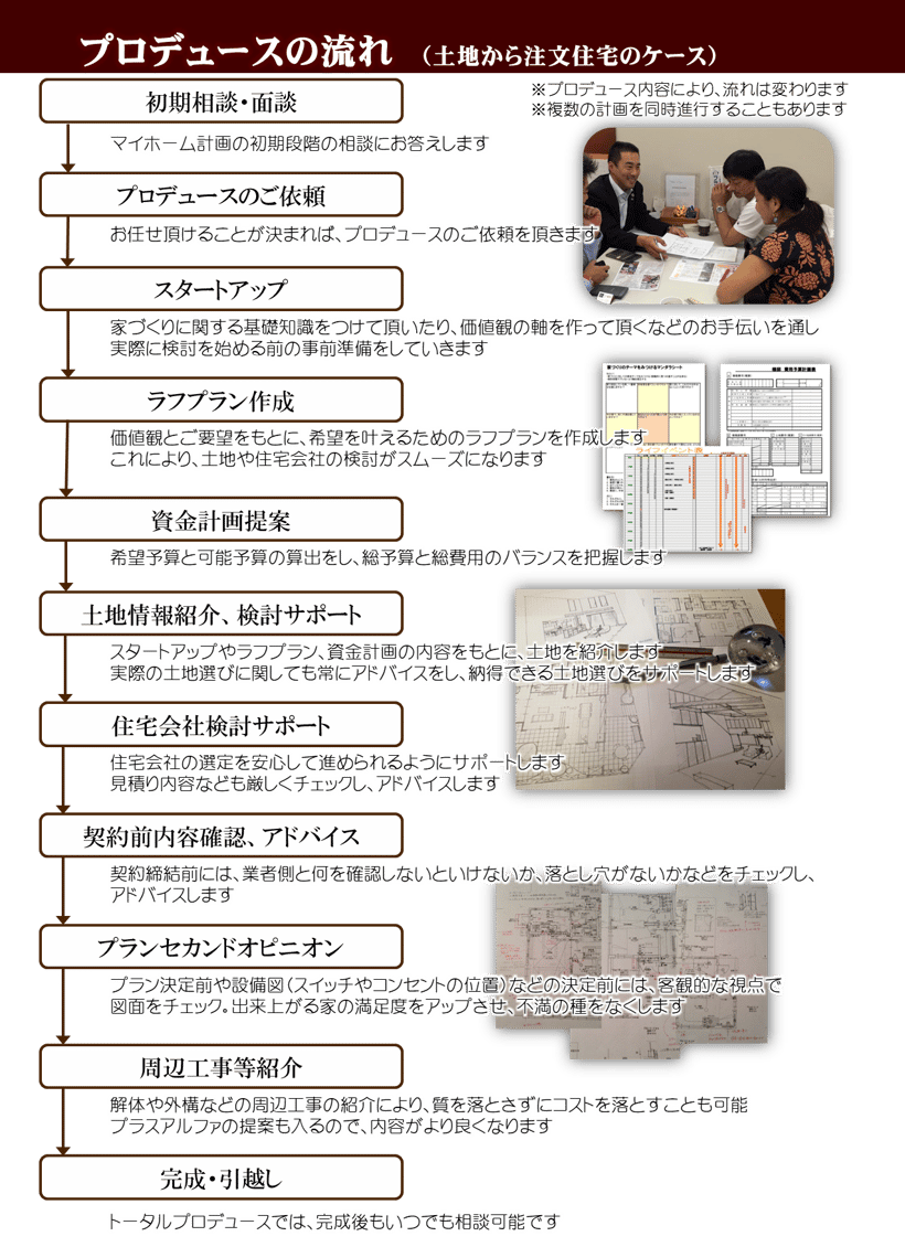 マイホームプロデュースのメリット、どんな流れになるのかなど、こちらで紹介しています。